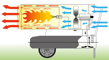 El cañón es una turbina que impulsa el calor generado al ambiente por la combustión del gasoil mediante aire forzado. Se puede pasar la mano o caminar a un metro de la boca del equipo sin peligro de quemarse. La carcasa externa se puede tocar estando en funcionamiento y el calor sale solo por el frente, la combustión es interna y no sobresale llama alguna.